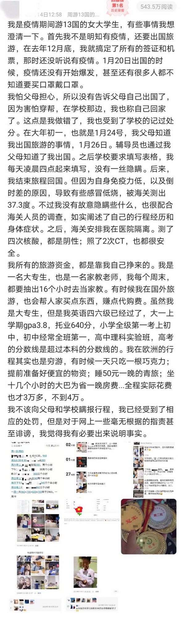 記者從小Y處了解到,1月20日,她出發(fā)開始旅行并于3月3日從珠海入境回國(guó),期間共游玩13個(gè)國(guó)家?!?0月份就已經(jīng)決定出去玩,11月一直在準(zhǔn)備簽證,12月中旬簽證什么的都已經(jīng)準(zhǔn)備好了?!庇捎诤ε赂改笓?dān)心她一人在外旅行的安全問題,出發(fā)時(shí)并沒有告知父母?!?月23日,學(xué)校要求所有學(xué)生填寫一個(gè)假期所在地,我填寫的是‘在家’,因?yàn)椴幌胱尲依锶酥牢以趪?guó)外,害怕穿幫。出發(fā)時(shí)國(guó)內(nèi)疫情還沒有爆發(fā),所以不是很清楚國(guó)內(nèi)的疫情,也沒想到填這個(gè)信息是為了防控疫情所用,所以沒有如實(shí)填寫。大年初一,也就是1月24日,我父母知道了我出國(guó)的事,對(duì)我嚴(yán)厲批評(píng)。之后學(xué)校要求填寫表格,我沒有隱瞞,都是如實(shí)填寫?!?/p>