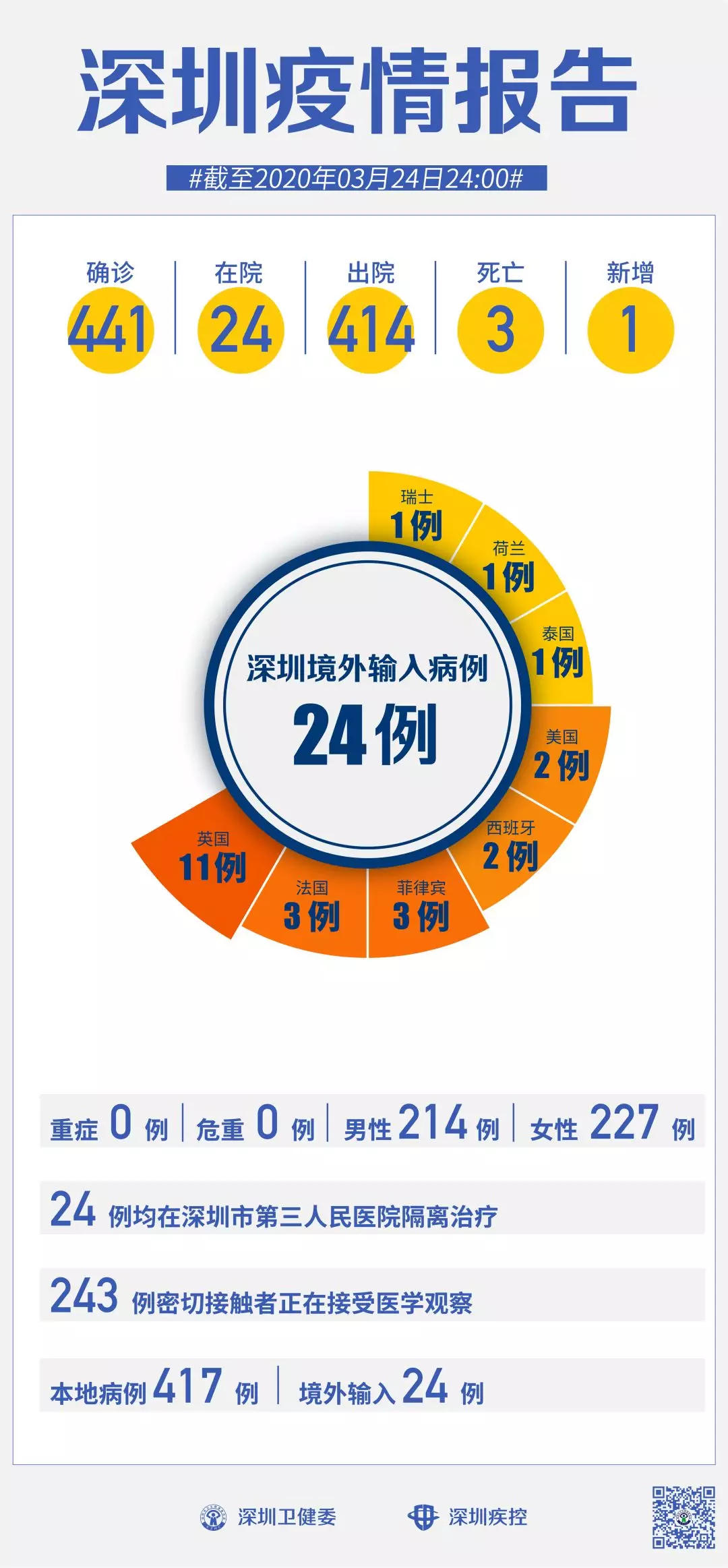 3月24日,深圳確診1例境外輸入“新冠肺炎”新病例,累計達24例。 病例24 男,31歲,巴西籍,在深圳工作,由英國返回。3月21日從英國倫敦乘坐SQ305航班飛往新加坡,22日從新加坡乘坐CZ3040航班飛往中國廣州,當晚經(jīng)廣州白云機場入境,入境體溫36.6℃。23日凌晨由專車送往深圳集中隔離觀察,24日新冠病毒核酸初篩陽性,當天深圳市疾控中心復核亦為陽性。 目前患者已被轉到深圳市第三人民醫(yī)院隔離治療。經(jīng)初步判定,在中國內(nèi)地有32名密切接觸者,已集中隔離。 截至3月24日24時,深圳累計報告“新冠肺炎”病例441例。3月24日當天新增1例。 累計報告確診病例中,男性214例、女性227例。 目前,死亡3例,累計出院414例。 24例確診病例均在深圳市第三人民醫(yī)院隔離治療。 243名密切接觸者正在接受醫(yī)學觀察。 資料來源:深圳市疾控中心、深圳市衛(wèi)健委、廣東省衛(wèi)健委