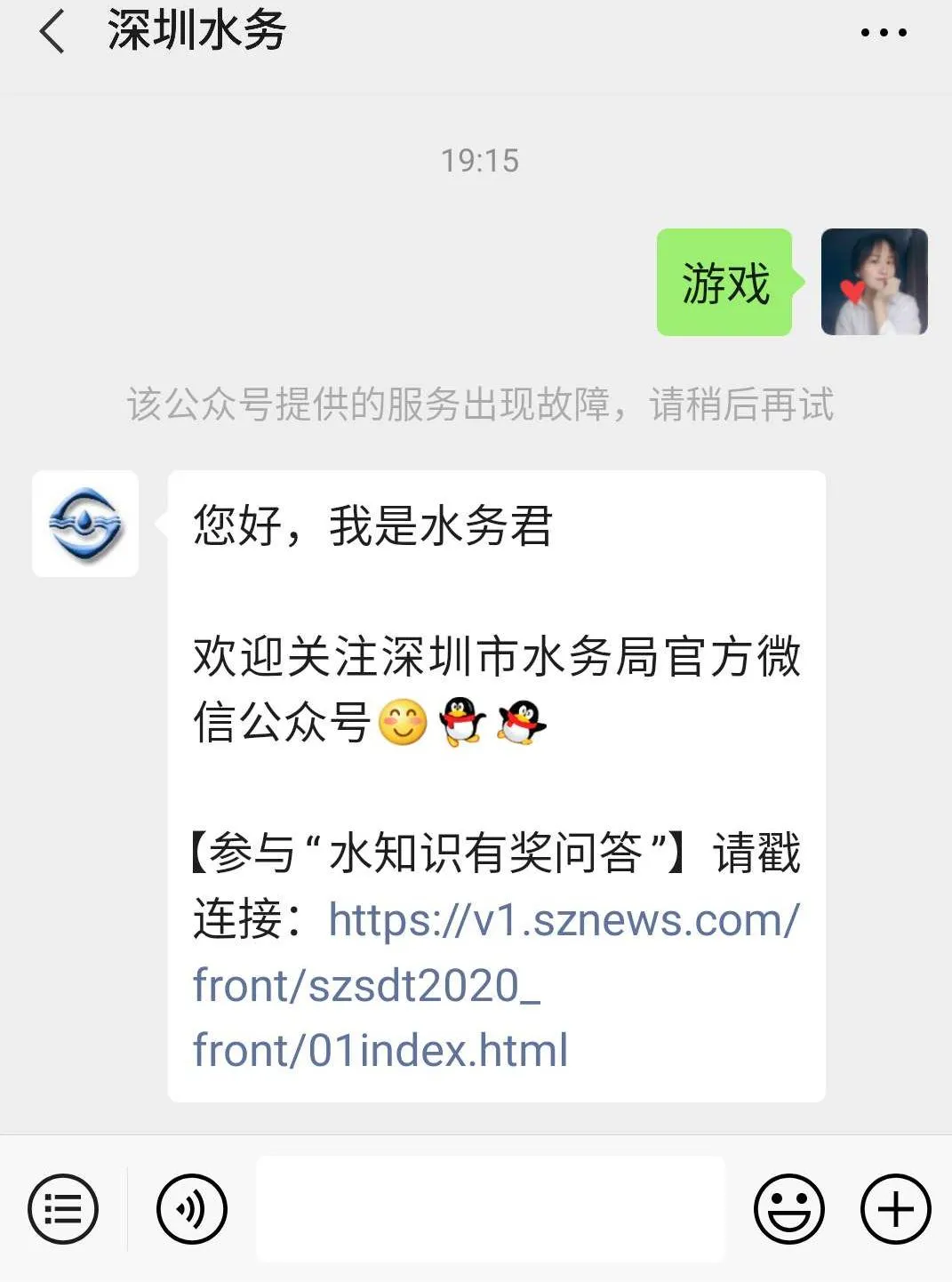 如果您已經(jīng)關注了“深圳水務”,可以在公眾號留言欄輸入“游戲”、“答題”“紅包”等關鍵詞哦。