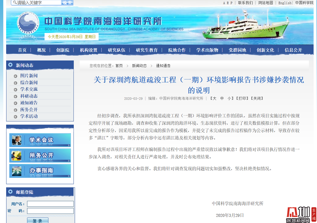 見(jiàn)圳客戶端·深圳新聞網(wǎng)2020年3月29日(見(jiàn)圳客戶端、深圳新聞網(wǎng)記者 鐘鴻冰)3月29日,中國(guó)科學(xué)院南海海洋研究所在官網(wǎng)發(fā)布說(shuō)明稱:深圳灣航道疏浚工程(一期)環(huán)境影響評(píng)價(jià)工作雖按規(guī)定進(jìn)行了現(xiàn)場(chǎng)踏勘,調(diào)查并收集了有關(guān)資料等環(huán)節(jié),但因采用其以前的報(bào)告作為模板,并將未完成的報(bào)告作為公示材料,導(dǎo)致公示的環(huán)評(píng)報(bào)告中出現(xiàn)多處錯(cuò)誤。南海海洋研究所表示,將對(duì)相關(guān)責(zé)任人嚴(yán)肅處理并公示處理結(jié)果。