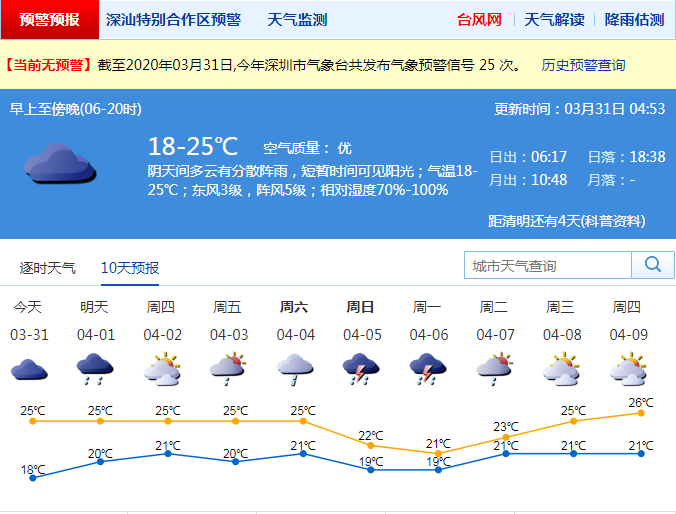 見圳客戶端·深圳新聞網(wǎng)2020年3月31日訊 31日陰天間多云,有零星小雨和輕霧,氣溫19-25℃;1日至4月3日多云到陰天,部分時間有分散小雨和輕霧;4-6日有一次明顯降雨過程。