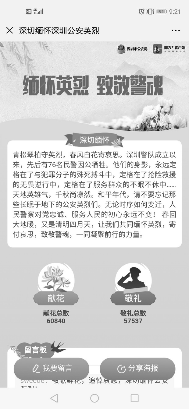 據(jù)介紹,鑒于當前疫情防控形勢,市公安局不組織集體祭掃活動,通過公安內(nèi)網(wǎng)、互聯(lián)網(wǎng)等網(wǎng)絡開設“緬懷英烈”專欄開展“網(wǎng)上祭掃”活動,市民群眾可點擊深圳公安微信公眾號,向公安英烈獻花、留言,寄托哀思,致敬警魂。