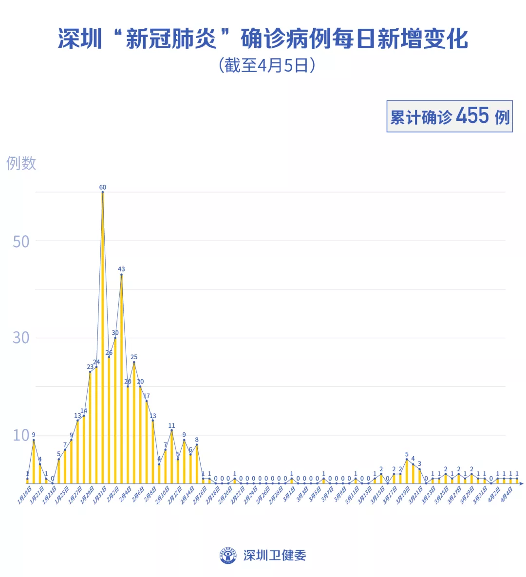 截至4月5日24時,深圳累計報告新冠肺炎病例455例。4月5日當(dāng)天新增境內(nèi)病例1例,新增無癥狀感染者2例,出院1例。