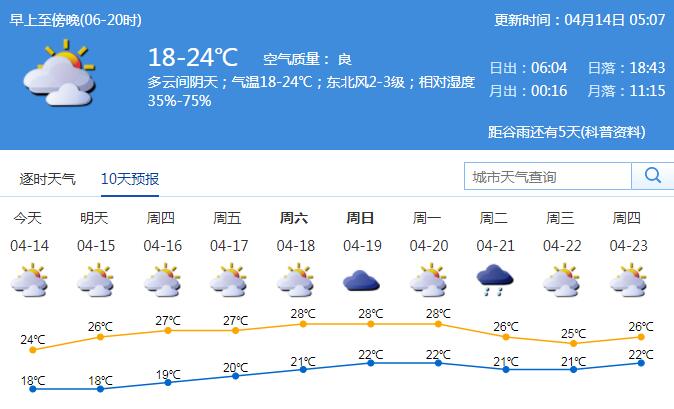 14日我市多云間陰天;氣溫18-24℃;東北風(fēng)2-3級(jí);相對(duì)濕度35%-75%,全市森林火險(xiǎn)黃色預(yù)警信號(hào)生效中。