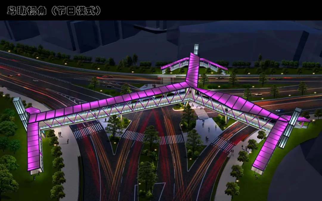 項(xiàng)目位于南山區(qū)東濱路與南山大道交叉口處,采用三個(gè)方向主梁互為120°交角的“Y”形方案。主梁總長(zhǎng)163米,采用連續(xù)鋼箱梁,梯道采用鋼結(jié)構(gòu)。主橋每個(gè)端部均設(shè)置2座鋼結(jié)構(gòu)梯道和1部垂直電梯。
