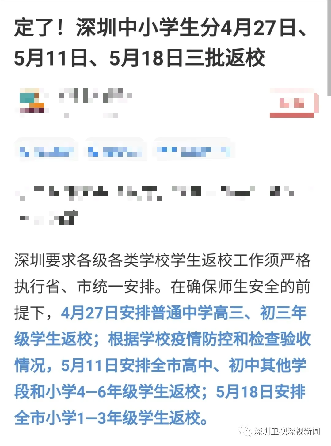 近日,有媒體報(bào)道稱,深圳中小學(xué)生返校時(shí)間已確定。5月11日安排全市高中、初中其他學(xué)段和小學(xué)4—6年級學(xué)生返校;5月18日安排全市小學(xué)1—3年級學(xué)生返校。