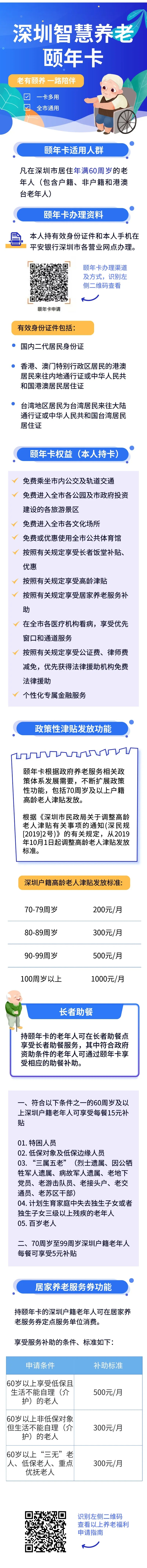據(jù)悉,凡在深圳市居住年滿60周歲以上的老年人(包含港澳臺老年人),均可持有效身份證件和手機申請辦理。“頤年卡”持卡人,可享受敬老優(yōu)待,包括免費進入全市各公園,免費進入市政府投資建設各旅游景區(qū),免費乘坐市內(nèi)公交車和軌道交通。70周歲及以上戶籍老人還可享受高齡津貼發(fā)放;符合規(guī)定的戶籍老年人可享受居家養(yǎng)老消費的優(yōu)惠和補貼,包括:生活照料、家政服務、康復護理服務、日托服務、心理咨詢等。