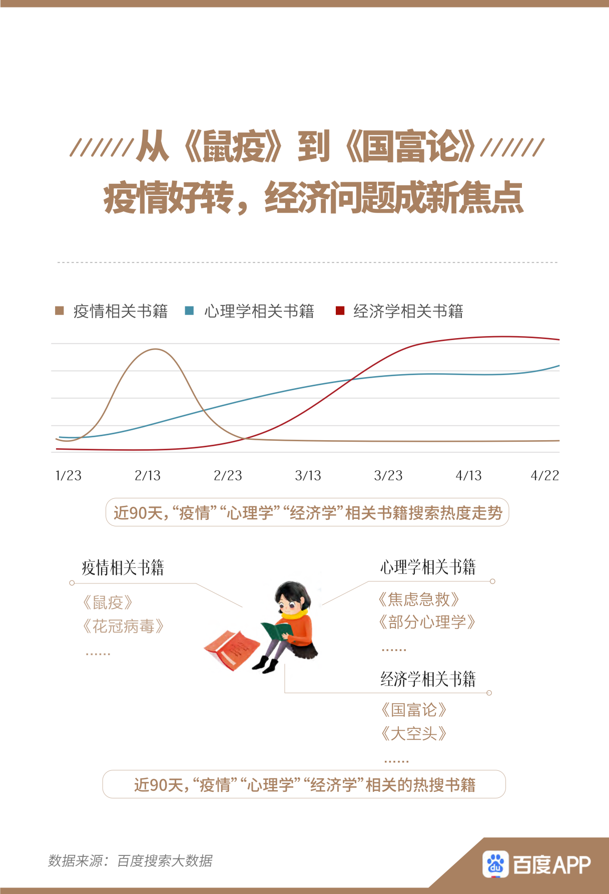 與此同時,疫情變化也影響著人們的閱讀“口味”。報告顯示,在疫情暴發(fā)之初,與“疫情”相關(guān)書籍的搜索熱度迅速上升,《鼠疫》、《花冠病毒》等具有疫情背景的書籍成為熱搜。隨著國內(nèi)疫情好轉(zhuǎn),疫情對心理、經(jīng)濟(jì)的影響逐漸受到人們更多關(guān)注,《焦慮急救》、《國富論》等“心理學(xué)”、“經(jīng)濟(jì)學(xué)”相關(guān)書籍的搜索熱度均在3月上漲。