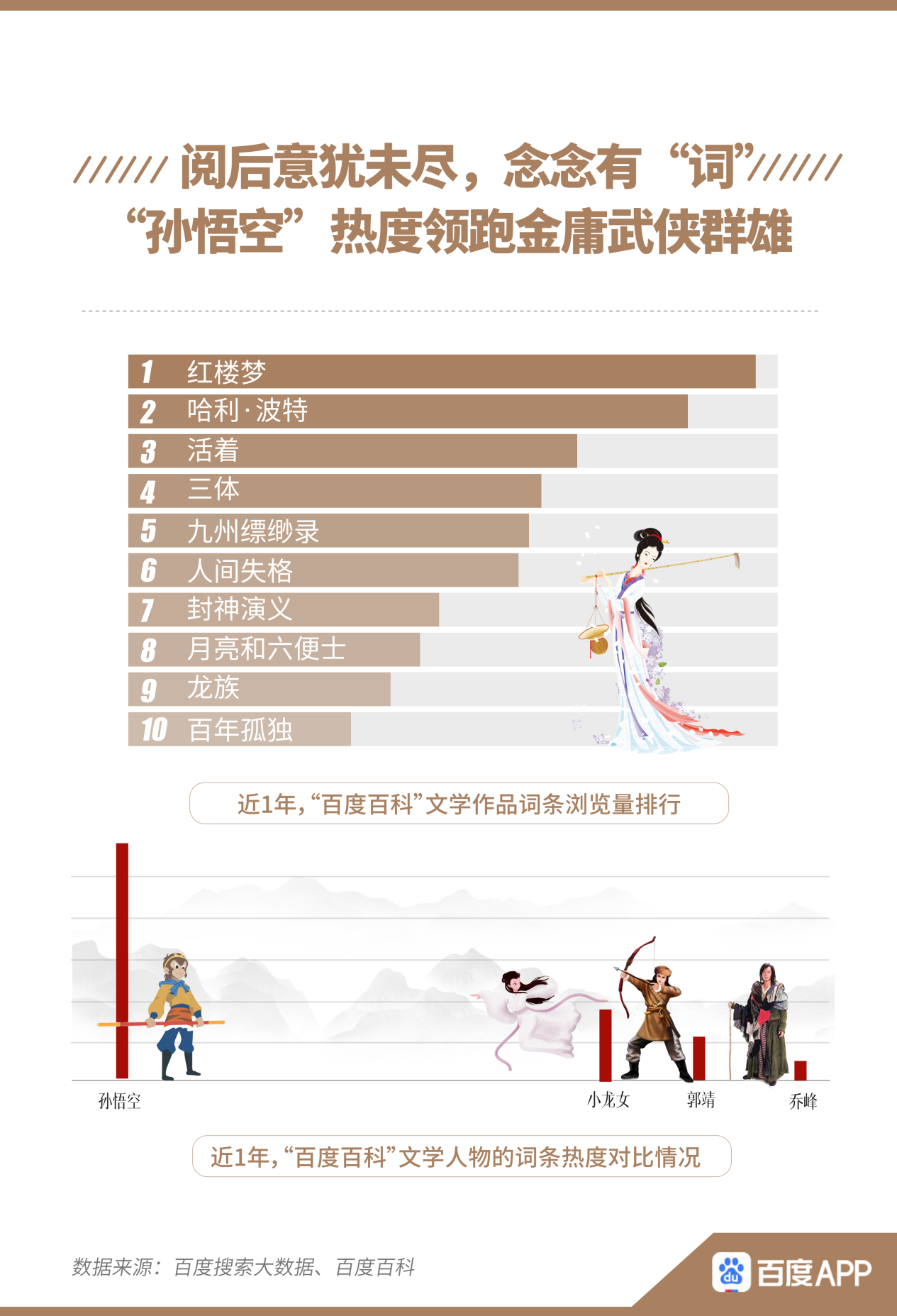 而百度百科的數(shù)據(jù)表明,人們在閱讀經(jīng)典書籍后,點擊詞條查看更多背景、釋義也是常態(tài)?!都t樓夢》、《哈利·波特》、《活著》、《三體》是近1年來網(wǎng)友在百度百科瀏覽較多的文學(xué)作品相關(guān)詞條。