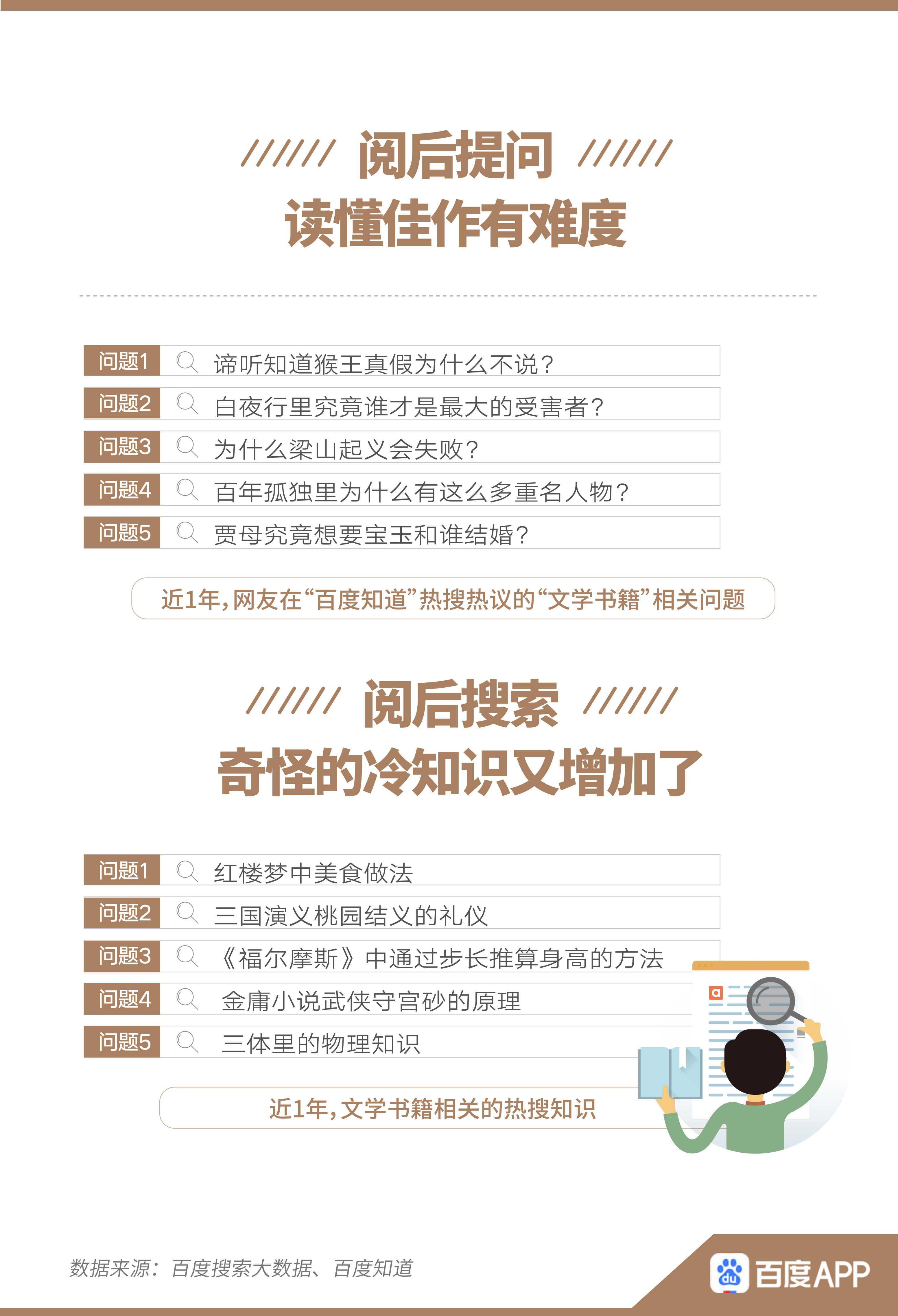 閱后提出對書籍的疑惑、討論思考、參與表達(dá),均是讀者的重要需求。報告顯示,近1年,不少網(wǎng)友在閱讀之后,選擇到百度知道提問、討論。例如,“諦聽知道猴王真假為什么不說”、“白夜行究竟誰是最大受害者”等情節(jié)相關(guān)問題,均引起網(wǎng)友的熱搜熱議。除此之外,在百度搜索與主要情節(jié)無關(guān)的“冷”知識的人也不在少數(shù),如“紅樓夢中美食做法”、“三體里的物理知識”等。