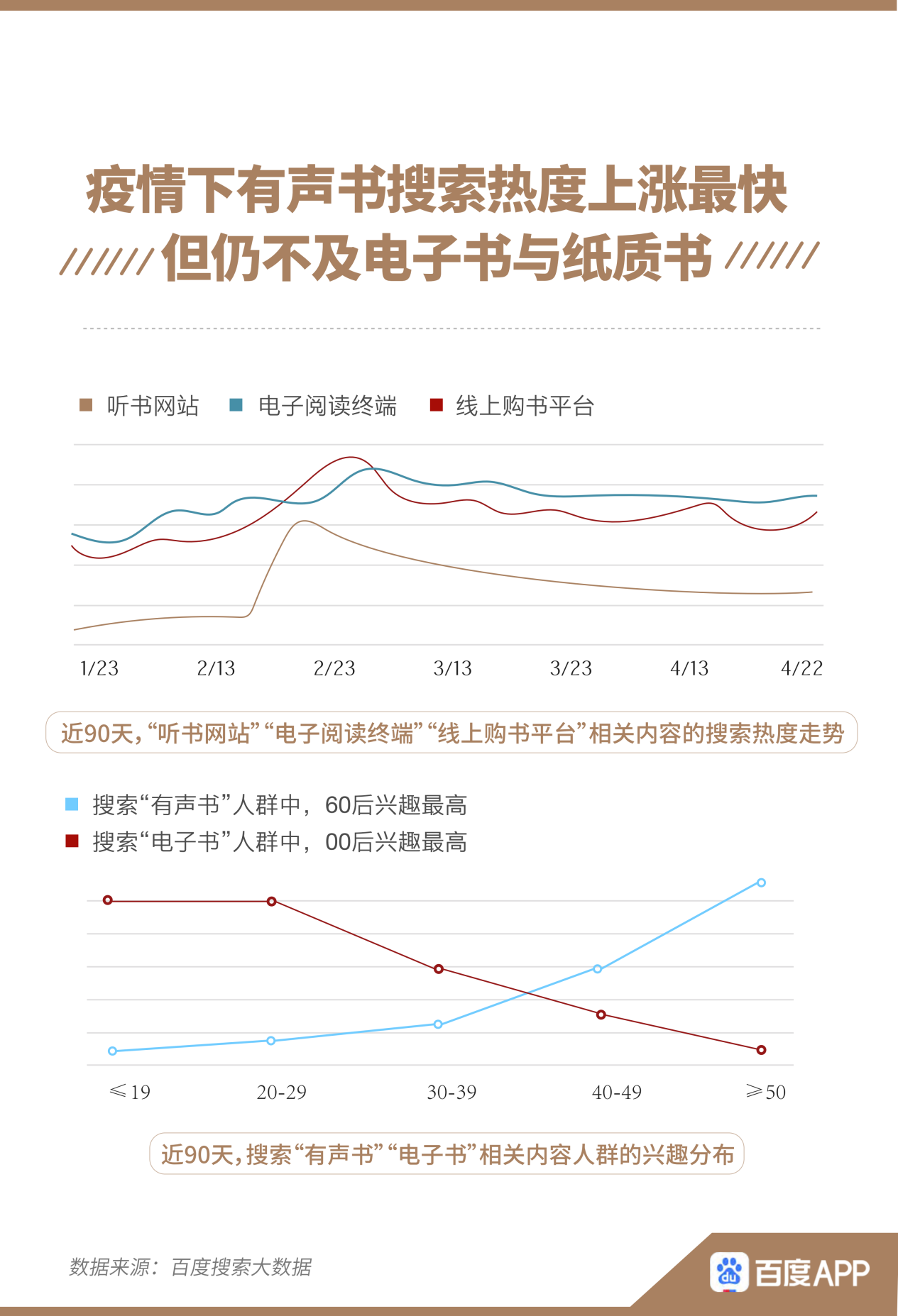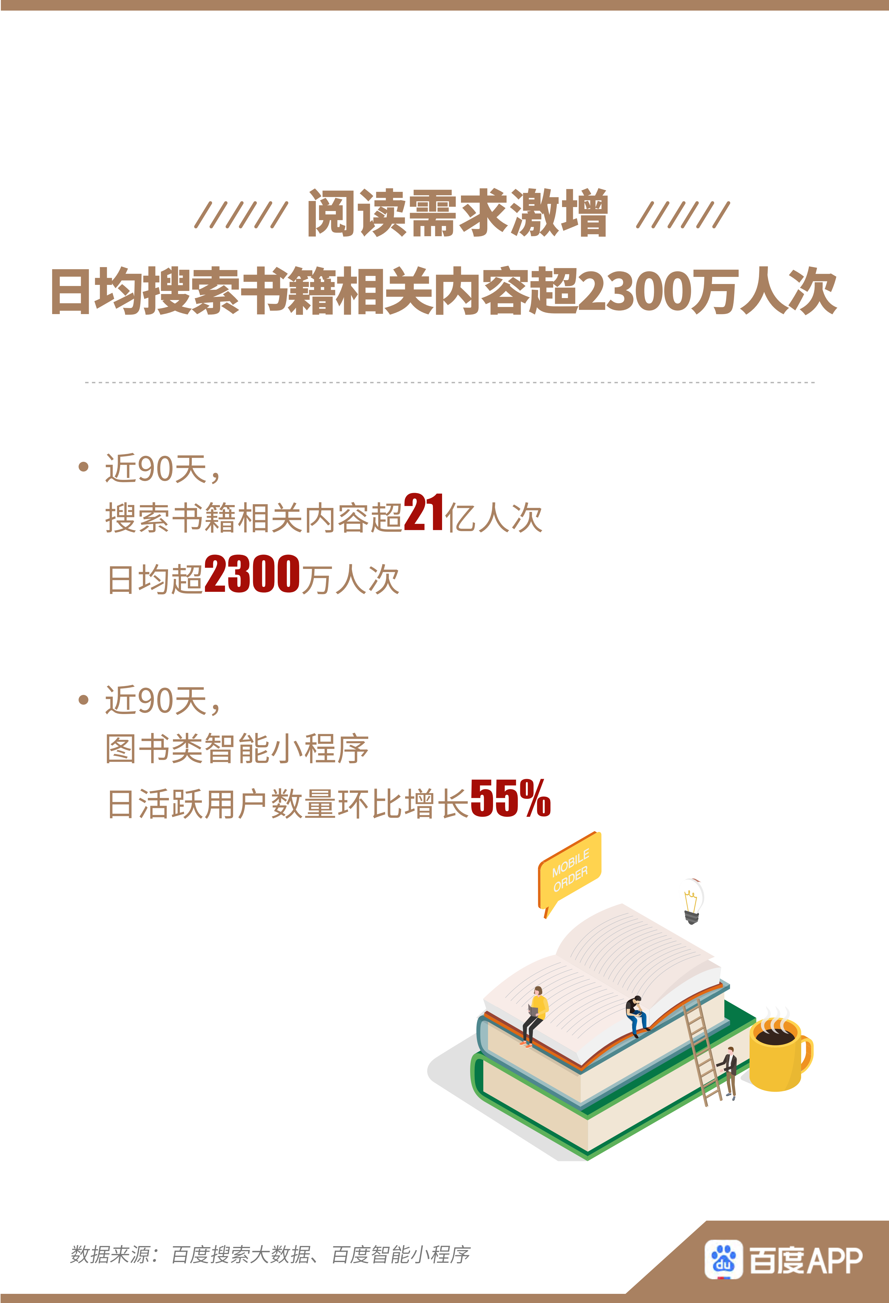 近日,百度APP聯(lián)合人民日報數(shù)字傳播《有數(shù)青年》工作室發(fā)布的《百度全民讀書搜索大數(shù)據(jù)報告》(以下簡稱“報告”)顯示,疫情宅家使網(wǎng)友閱讀需求激增,近90天,日均超2300萬人次在百度搜索書籍相關(guān)內(nèi)容,累計超21億人次,圖書類智能小程序日活躍用戶環(huán)比增長55%,讀書、購書線上化再進(jìn)一步。