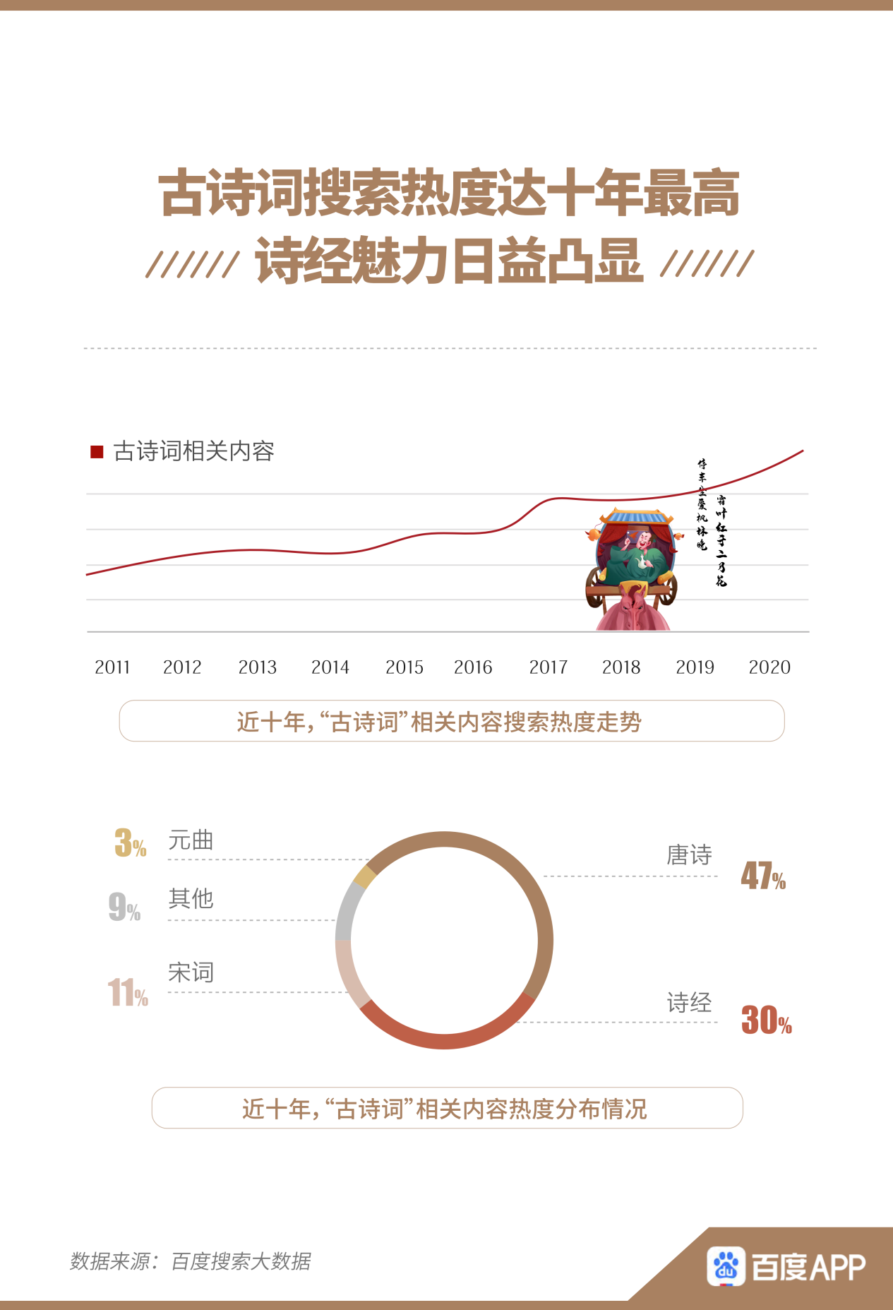 事實上,“四大名著”熱度年勝一年的背后,是人們對傳統(tǒng)文化的熱愛日益提升。這也反映在古詩詞的搜索熱度之上。報告顯示,古詩詞搜索熱度逐年攀升,在2020年達(dá)十年最高。詩經(jīng)越來越多地出現(xiàn)在人們視野之中,搜索熱度占比30%。