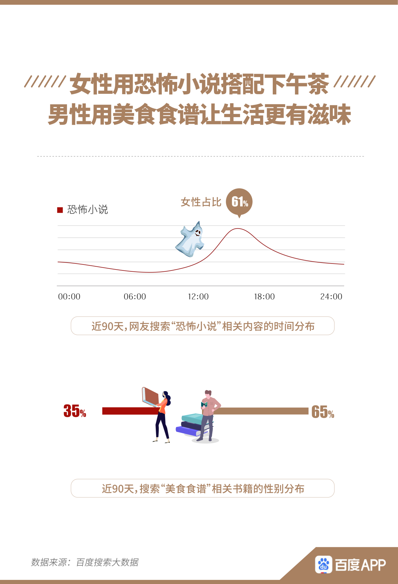 與往常印象相反,搜索“恐怖小說”相關(guān)內(nèi)容的人群中,女性比男性更多,占比61%,下午15時是搜索的高峰時間。而男性更關(guān)注“美食食譜”相關(guān)書籍,在搜索相關(guān)書籍的人群中占比65%。