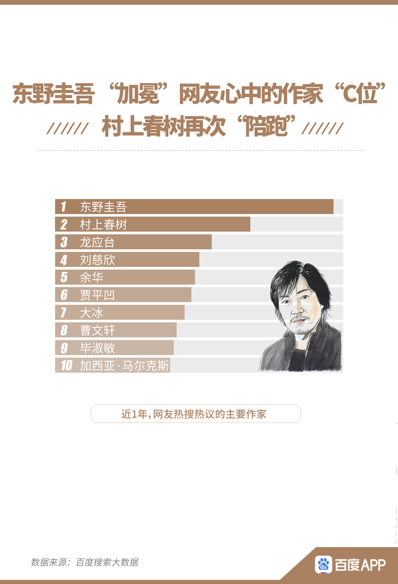 經(jīng)典深入人心,也無礙閱讀世界百家爭鳴。報告盤點了近1年網(wǎng)友熱搜熱議的主要作家,推理小說家東野圭吾占熱度C位,村上春樹位居第二,再“陪跑”。