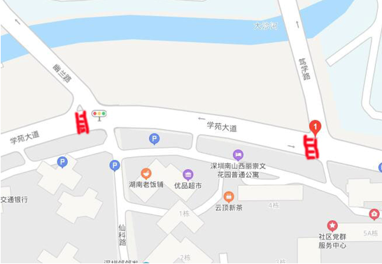 紅色畫筆標示的地方,即為學苑大道上設計不合理的斑馬線。