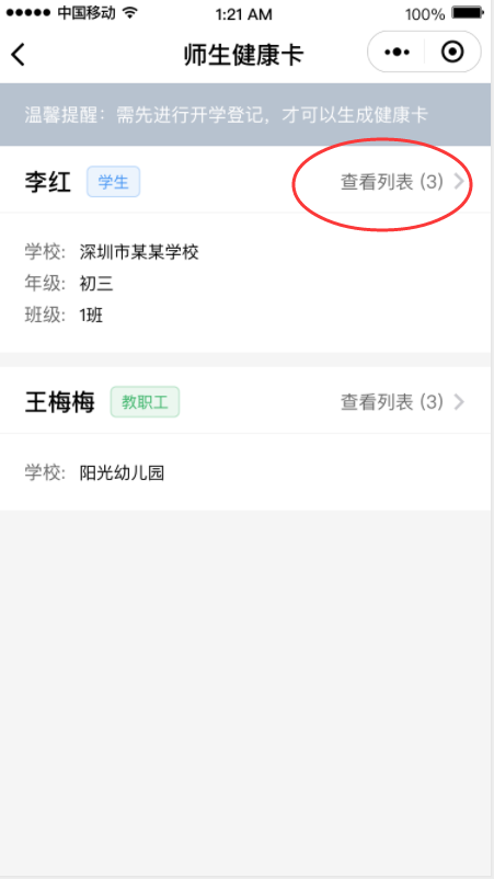 在開學(xué)專區(qū)點(diǎn)擊“師生健康卡信息”,然后點(diǎn)擊“查看列表”,可查看您的健康申報(bào)記錄,點(diǎn)擊“重新生成健康卡”進(jìn)行更新。