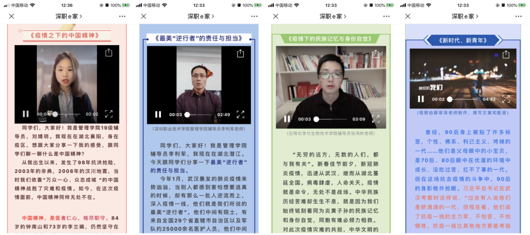 深圳職業(yè)技術(shù)學(xué)院學(xué)生工作部組織33位青年輔導(dǎo)員,推出33講戰(zhàn)“疫情”系列微課程,每天8:30準(zhǔn)時推送。微課程主題涵蓋愛國主義教育、理想信念教育、生命教育、社會責(zé)任感教育、感恩教育,不同的主題、不同的視頻、不同的感悟,輔導(dǎo)員老師和同學(xué)們一起在戰(zhàn)“疫”中成長,為同學(xué)們講述每一個戰(zhàn)“疫”的感人故事。建環(huán)學(xué)院輔導(dǎo)員薛菲菲老師制作精美短視頻、撰寫文案、配樂、配音,以有思想又有溫度的方式與學(xué)生對話。她說,磨煉是成長的催化劑,抗疫是時代給予的成人禮,經(jīng)此一役,中國的年輕人們對責(zé)任和奉獻(xiàn)的感受更加直觀,對勇敢和擔(dān)當(dāng)?shù)睦斫飧由羁?,而中國,也因?0后,收獲了青春洋溢的蓬勃力量!