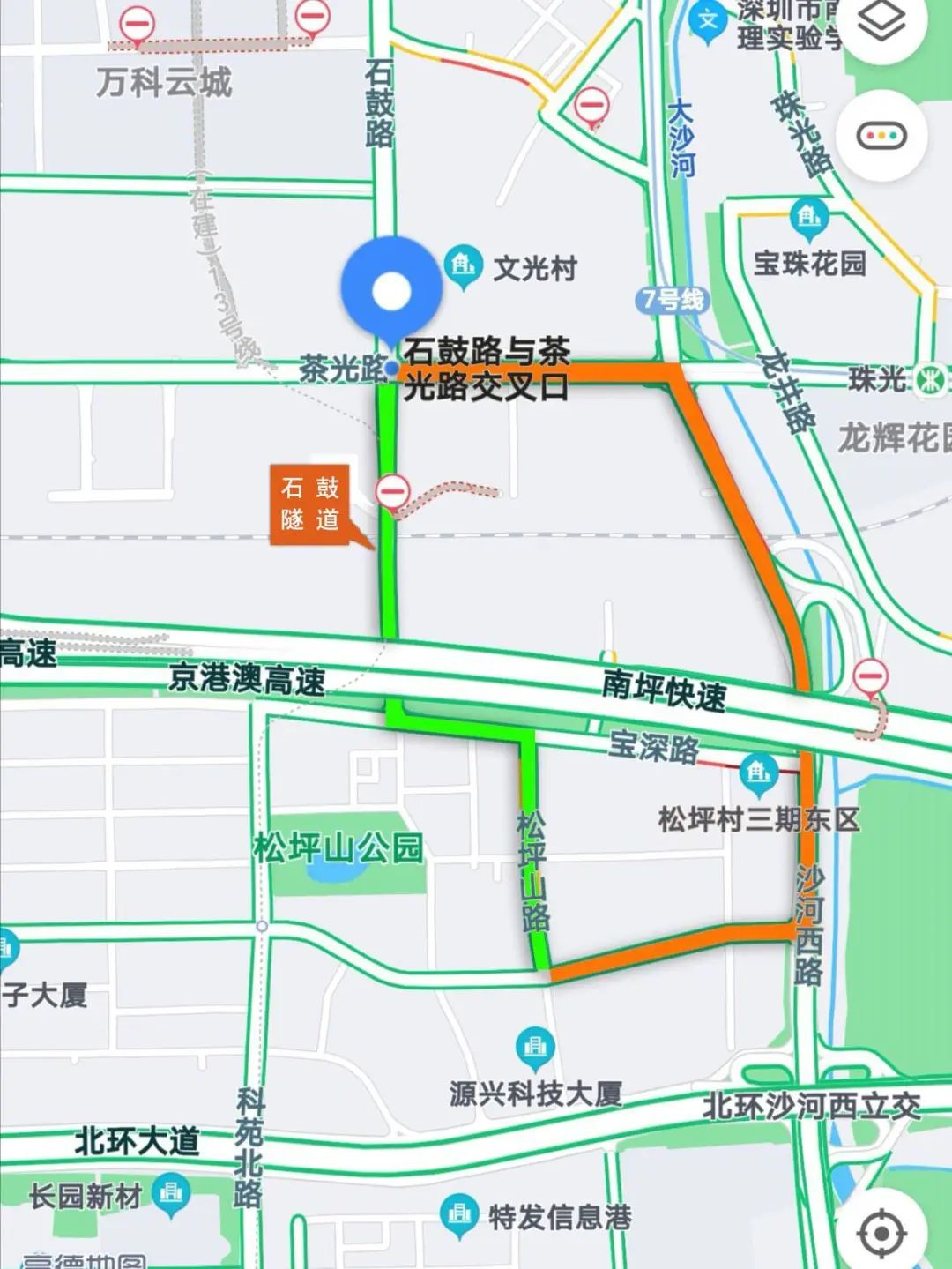 ▲西麗往科技園北區(qū)此前需繞行沙河西路(黃色途徑),現(xiàn)經(jīng)石鼓隧道可快速到達(dá)(綠色途徑)。
