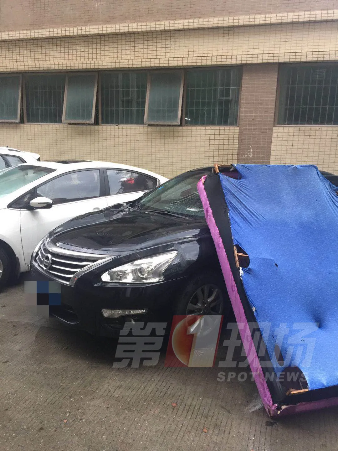 其中,龍華民治春華四季園42棟高層的儲(chǔ)水箱,砸到了樓下藍(lán)色轎車,造成車輛發(fā)動(dòng)機(jī)蓋一處凹陷,多處刮痕。