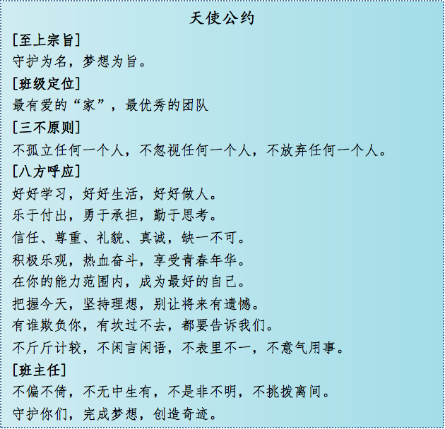 詹老師所帶班級(jí)嚴(yán)格遵守著“公約精神”,創(chuàng)造了一個(gè)個(gè)驚喜:2015級(jí)14班在藝術(shù)季班級(jí)文化設(shè)計(jì)中是全校唯一全員參與的班級(jí);2016級(jí)8班在跳繩比賽中從練習(xí)時(shí)的倒數(shù)第一到復(fù)賽逆襲闖進(jìn)決賽獲得一等獎(jiǎng);2017級(jí)9班在疫情網(wǎng)課期間堅(jiān)持每科作業(yè)“今日事今日畢”,無(wú)一人掉隊(duì)。