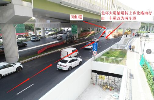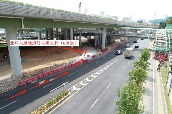北環(huán)大道主道轉(zhuǎn)上步北路南行路口封閉作應(yīng)急使用,為緩解輔路壓力,北環(huán)大道輔道轉(zhuǎn)上步北路南行由原一車道改為兩車道,新增的車道于5月18日同步開通。