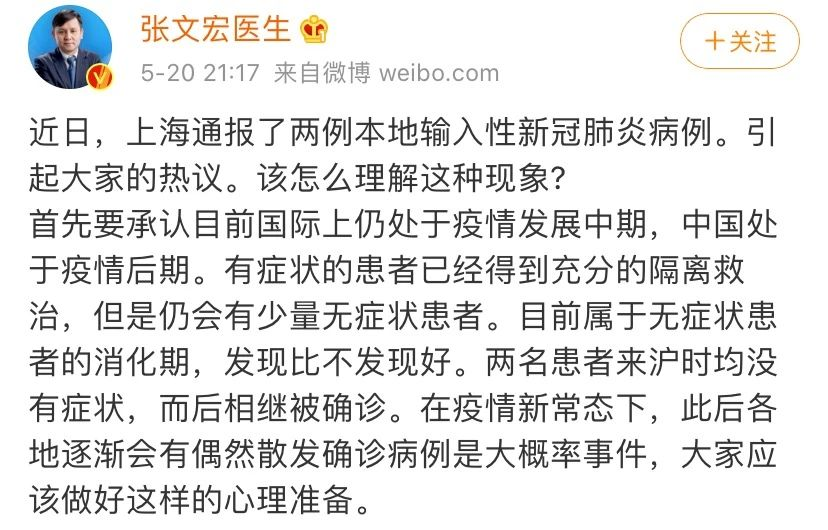 近日,上海通報(bào)了兩例本地輸入性新冠肺炎病例。20日晚間,上海新冠肺炎醫(yī)療救治組組長、復(fù)旦大學(xué)附屬華山醫(yī)院感染科主任張文宏發(fā)布微博稱,兩名患者來滬時均沒有癥狀,而后相繼被確診。