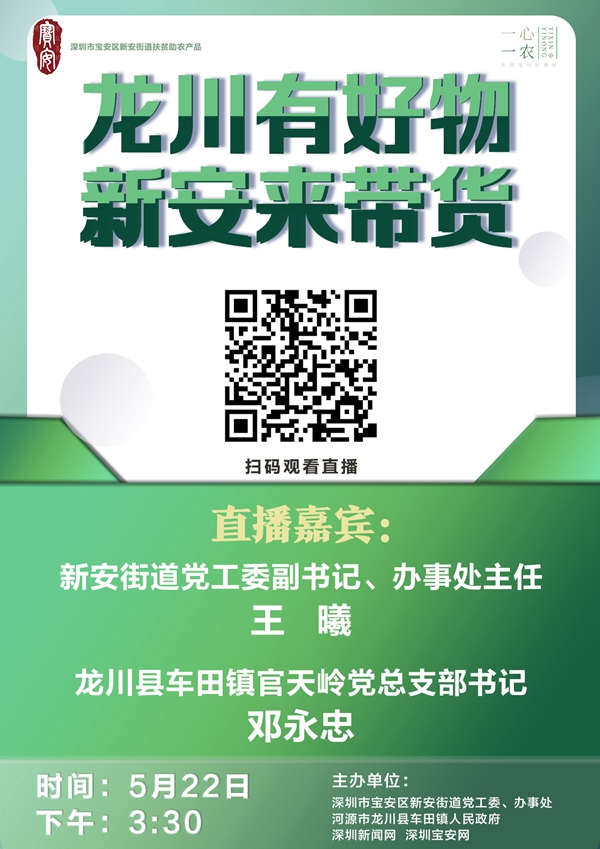 5月22日下午3:30,新安街道黨工委副書(shū)記、辦事處主任王曦、龍川縣車田鎮(zhèn)官天嶺村支部書(shū)記鄧永忠還將作客深圳新聞網(wǎng)直播間,向網(wǎng)友推介綠殼雞蛋、黑豆腐竹、生態(tài)米、牛?;ㄉ葍?yōu)質(zhì)農(nóng)產(chǎn)品,通過(guò)電商打通貧困村農(nóng)產(chǎn)品銷售渠道。歡迎觀看,不見(jiàn)不散!