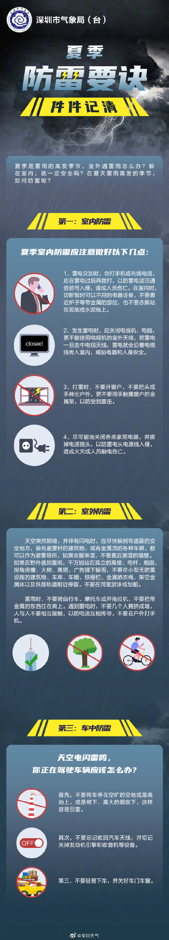 10時(shí)08分:【深圳市雷電預(yù)警】深圳市氣象臺(tái)于2020年05月26日10時(shí)10分在全市發(fā)布雷電預(yù)警,預(yù)計(jì)60分鐘內(nèi)全市將受雷電影響,按照防御預(yù)案停止戶(hù)外易燃易爆危險(xiǎn)作業(yè),并加強(qiáng)?;瘓?chǎng)所安全管理。