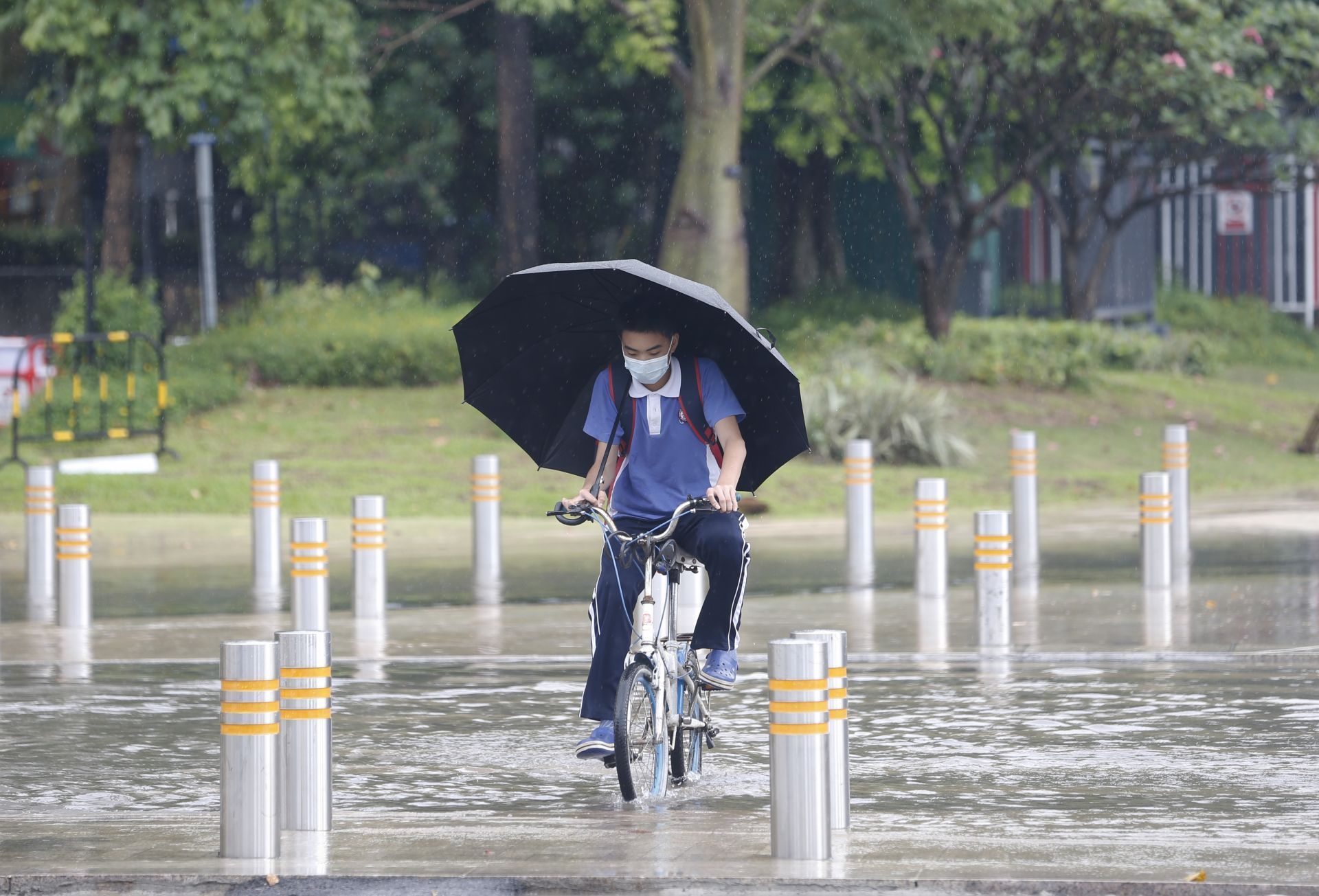 2020年5月26日中午13:27分,香梅路與紅荔西路交界處人行橫道,一名學生騎車小心翼翼經(jīng)過。