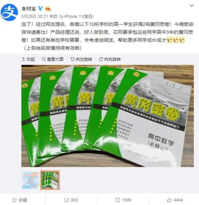 前段時間,支付寶發(fā)布了學(xué)雜費支持分期的微博,評論里有家長在呼喚學(xué)習(xí)資料,所以花唄產(chǎn)品經(jīng)理決定除了學(xué)雜費分期,再買2噸黃岡密卷送人。
