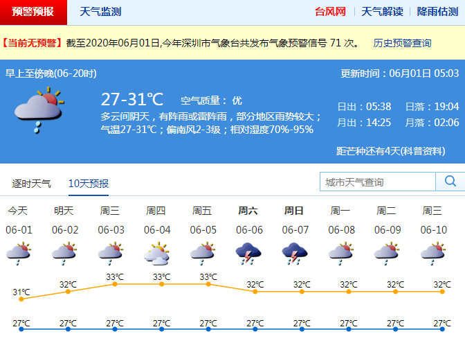 深圳市氣象臺預報,未來一周我市天氣仍不穩(wěn)定,雷雨多發(fā)。6月1日至5日,多云有陣雨或雷陣雨,局地雨勢較大,天氣漸趨悶熱。目前我市處于龍舟水降水多發(fā)季節(jié),需特別關(guān)注降雨給交通帶來的影響。請市民及時關(guān)注市氣象臺發(fā)布的最新氣象監(jiān)測預報和預警信息。