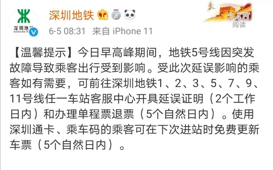 隨后,深圳地鐵官方微博發(fā)布溫馨提示,今日(6月5日)早高峰期間,地鐵5號(hào)線因突發(fā)故障導(dǎo)致乘客出行受到影響。受此次延誤影響的乘客如有需要,可前往深圳地鐵1、2、3、5、7、9、11號(hào)線任一車站客服中心開(kāi)具延誤證明(2個(gè)工作日內(nèi))和辦理單程票退票(5個(gè)自然日內(nèi))。使用深圳通卡、乘車碼的乘客可在下次進(jìn)站時(shí)免費(fèi)更新車票(5個(gè)自然日內(nèi))。
