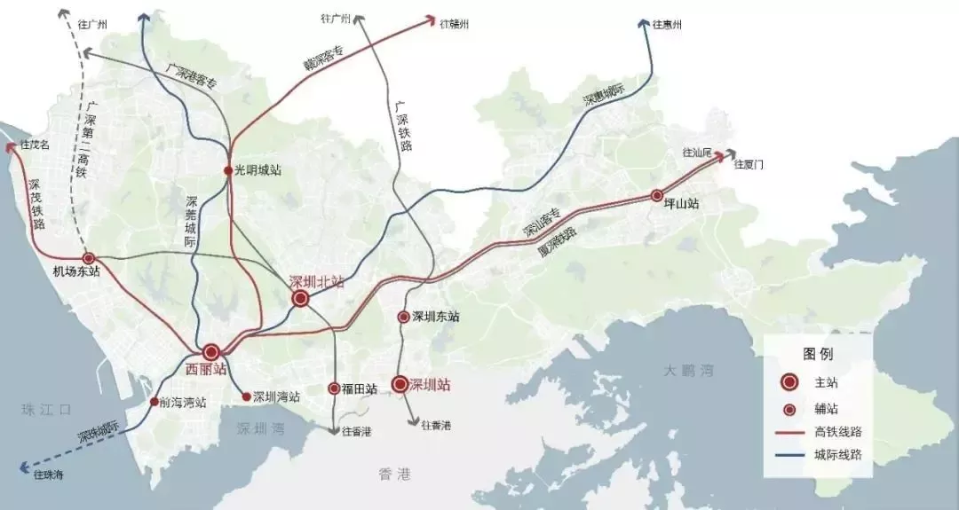 西麗綜合交通樞紐將引入贛深客專、深茂鐵路、深汕鐵路、深珠城際4條高鐵,深惠城際、深莞增城際2條珠三角城際鐵路和軌道13、15、27、29號線4條城市軌道。
