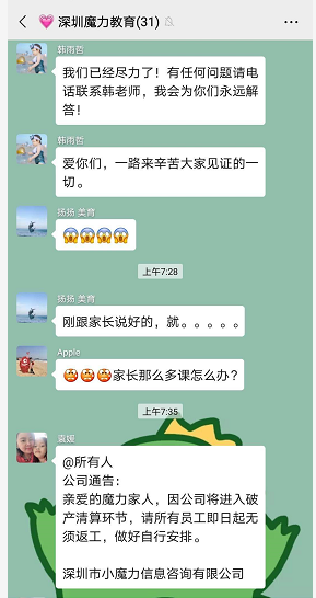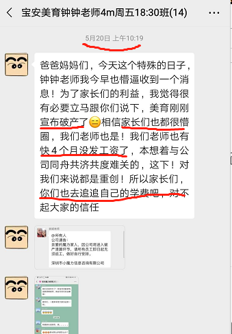 一名丁姓家長介紹,5月20日,家長接到美育老師消息,稱公司剛剛宣布破產(chǎn),老師工資被拖欠4個月。家長介紹,老師曝光該消息后,培訓機構(gòu)支付了他們的拖欠工資。隨后大量老師離職。