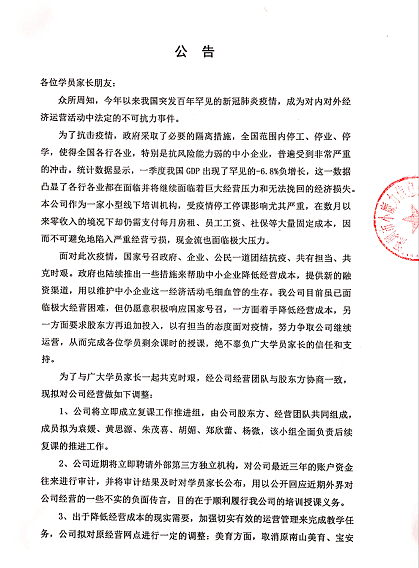 公告稱,公司成立由股東和老師組成的復課工作推進組,申請早日復課,時間初定于6月中旬;并將聘請外部第三方獨立機構(gòu)審計賬戶資金,澄清不實經(jīng)營傳言;還將取消寶安、南山兩個經(jīng)營網(wǎng)點,所有美育學生安排去福田上課。