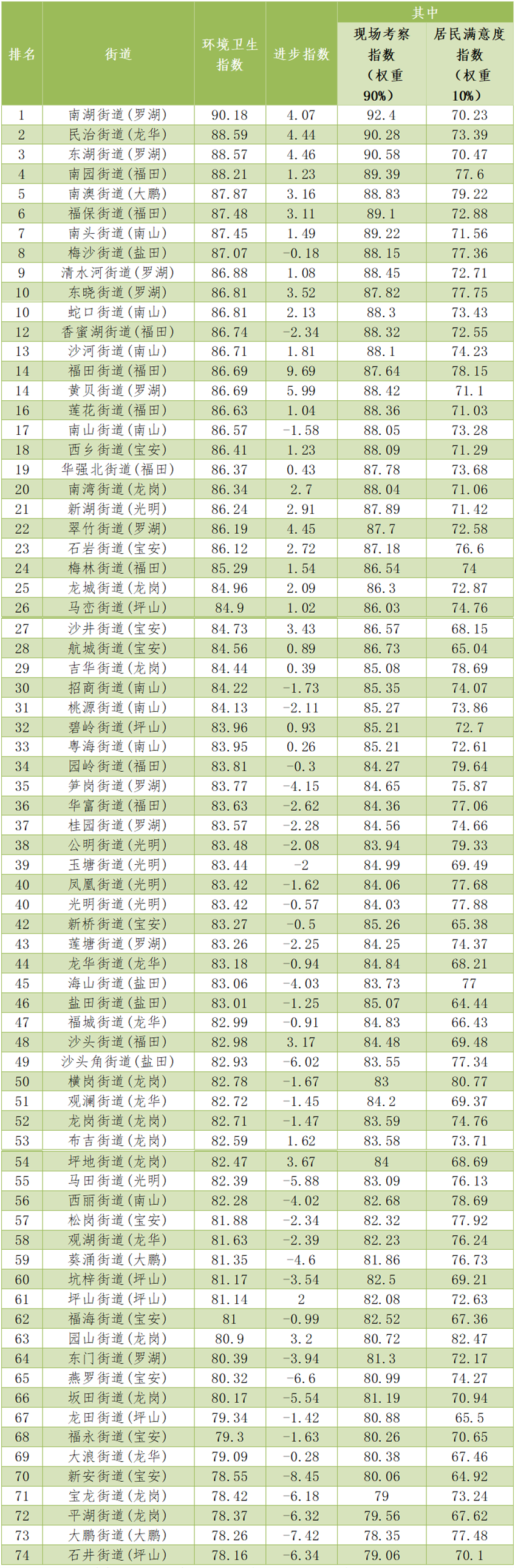 各街道環(huán)境衛(wèi)生指數(shù)得分第74名是石井街道(坪山),第73名是大鵬街道(大鵬),第72名是平湖街道(龍崗),第71名是寶龍街道(龍崗),第70名是新安街道(寶安)。