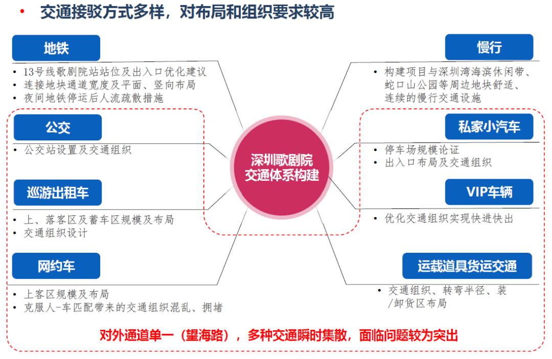 肯定了目前交通組織的總體方案,提出需充分利用地面望海路的交通疏散功能,考慮歌劇院作為地標(biāo)景點的吸引力,適當(dāng)增加停車位的彈性及可達(dá)性。同時建議市交通運輸局需結(jié)合深圳歌劇院的建設(shè)重新對望海路地下快速路的規(guī)劃方案開展研究工作。