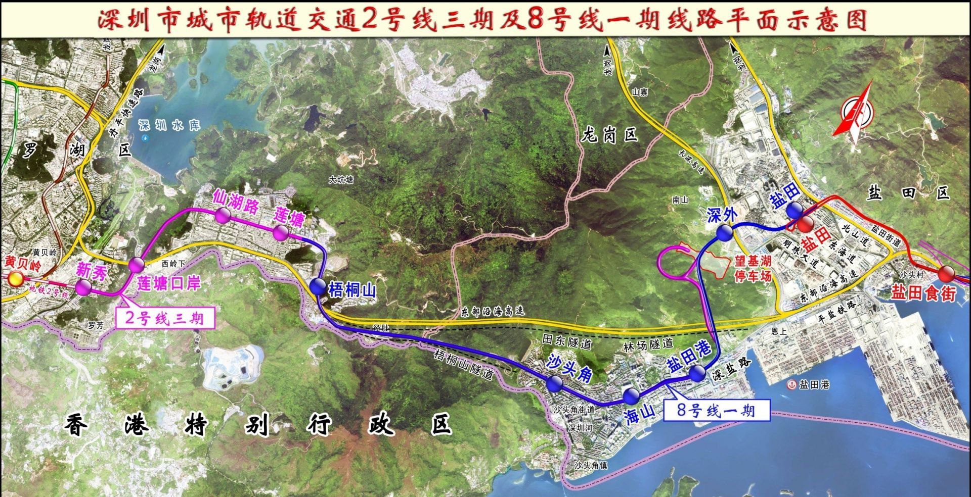 8號(hào)線一期工程由2號(hào)線三期工程蓮塘站站后折返線接出,起于梧桐山南站,終點(diǎn)為鹽田路站,后接包含大梅沙站、小梅沙站的8號(hào)線二期工程(在建),線路全長(zhǎng)12.34km,包含6站及6區(qū)間。