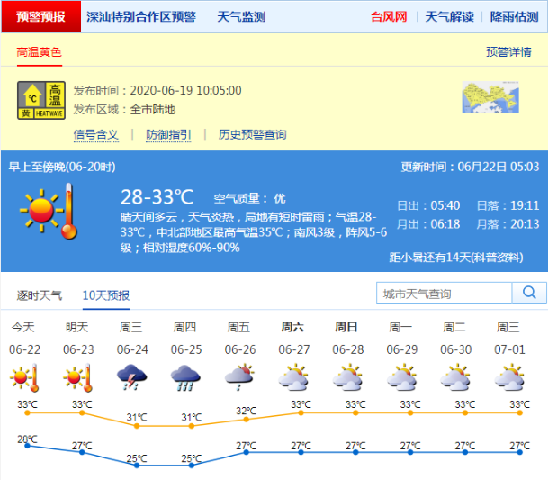據(jù)深圳氣象局消息,6月22日,深圳晴天間多云,天氣炎熱,局地有短時雷雨;氣溫28-33℃。