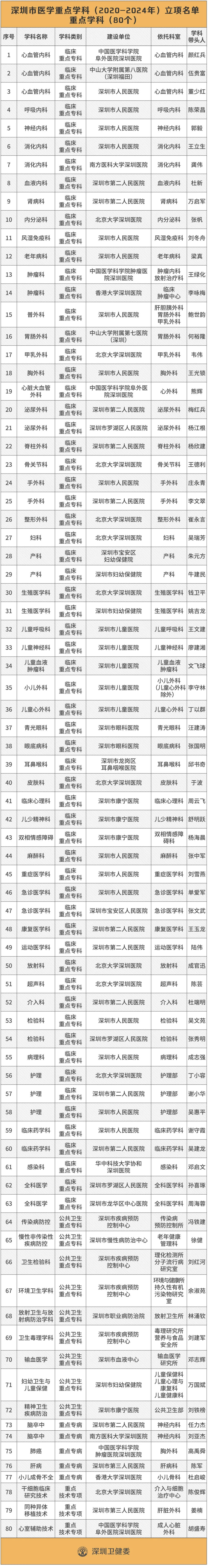 6月19日,深圳市衛(wèi)健委公布了2020-2024年的深圳市醫(yī)學(xué)重點(diǎn)學(xué)科立項(xiàng)名單,包括80個(gè)重點(diǎn)學(xué)科、15個(gè)重點(diǎn)培育學(xué)科。此外,深圳還有24個(gè)??迫脒x“省重點(diǎn)”名單,其中13個(gè)是國家衛(wèi)健委或國家中醫(yī)藥管理局認(rèn)定的國家級(jí)臨床重點(diǎn)??啤_@份名單是2019年由廣東省衛(wèi)健委公布的“廣東省高水平臨床重點(diǎn)??啤泵麊?。