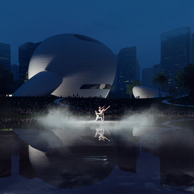 廣場(chǎng)中央的水池,可以作為劇場(chǎng),容納萬(wàn)人活動(dòng);景觀中預(yù)留出多處平臺(tái),提供公共藝術(shù)展覽、市集、藝術(shù)節(jié)、音樂(lè)節(jié)等戶外活動(dòng)場(chǎng)地;公園將城市的中軸線延續(xù)到海邊,行人步道、自行車道蜿蜒穿梭在建筑和草坪之間,為市民提供海濱休閑場(chǎng)地。