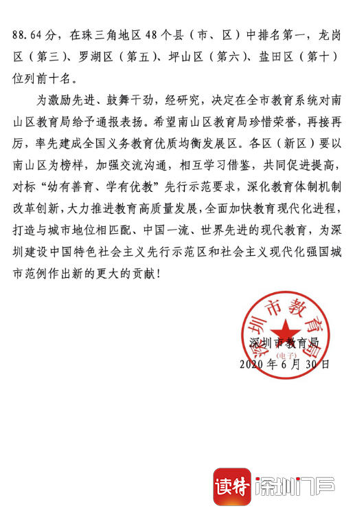 見圳客戶端·深圳新聞網(wǎng)2020年7月1日訊(深圳特區(qū)報記者 李麗)6月30日,《深圳市教育局關于表揚南山區(qū)教育局的通報》在全市教育界引起關注。通報表示,近日,廣東省人民政府教育督導室印發(fā)深圳市2018年度履行教育職責評價意見,深圳2018年度履行教育職責評價成績?yōu)?8.20分,在珠三角地區(qū)9個地級市中排名第一,其中,南山區(qū)成績?yōu)?8.64分,在珠三角地區(qū)48個縣(市、區(qū))中排名第一。經(jīng)研究,決定在全市教育系統(tǒng)對南山區(qū)教育局給予通報表揚,并希望南山區(qū)教育局率先建成全國義務教育優(yōu)質均衡發(fā)展區(qū)。