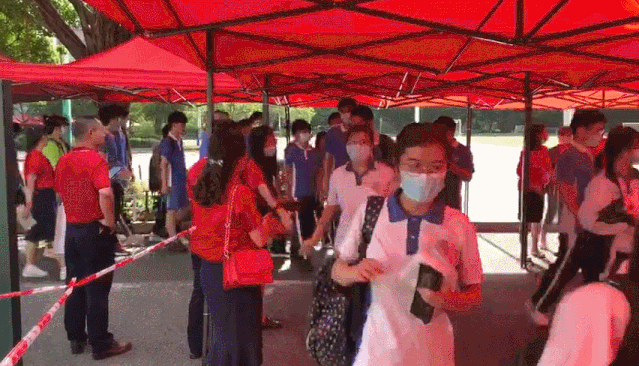 八點(diǎn)十分,學(xué)生走入考場(chǎng),身穿紅色衣服的老師在兩側(cè)為考生送上祝福?!凹佑?!”“老師我們出發(fā)了?!弊8B暣似鸨朔?/p>