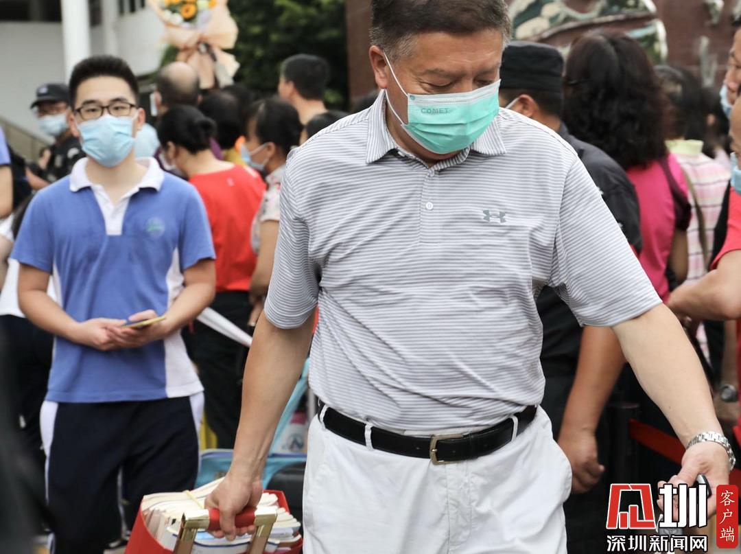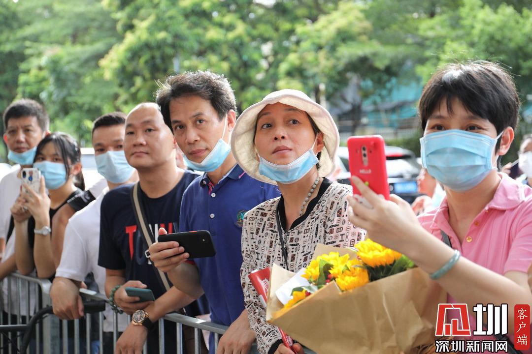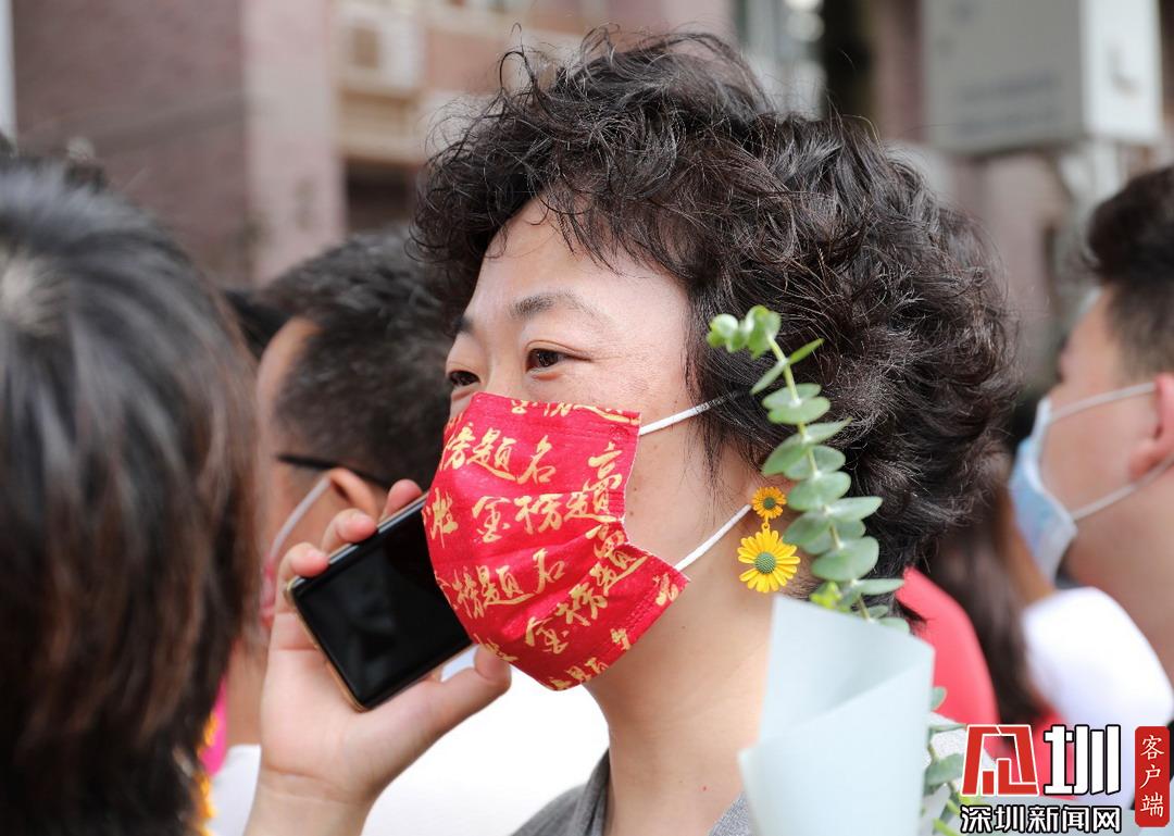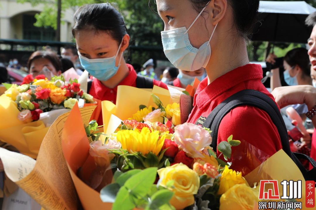 深圳高級中學(xué)考點外家長受捧鮮花、滿懷期待。
