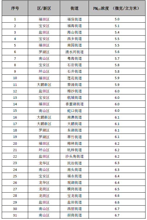 各區(qū)PM2.5平均濃度在6.1-8.3微克/立方米之間,濃度較低的有鹽田區(qū)、大鵬新區(qū)、福田區(qū)和南山區(qū),濃度較高的有光明區(qū)、龍華區(qū)和龍崗區(qū)。