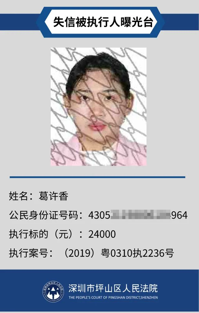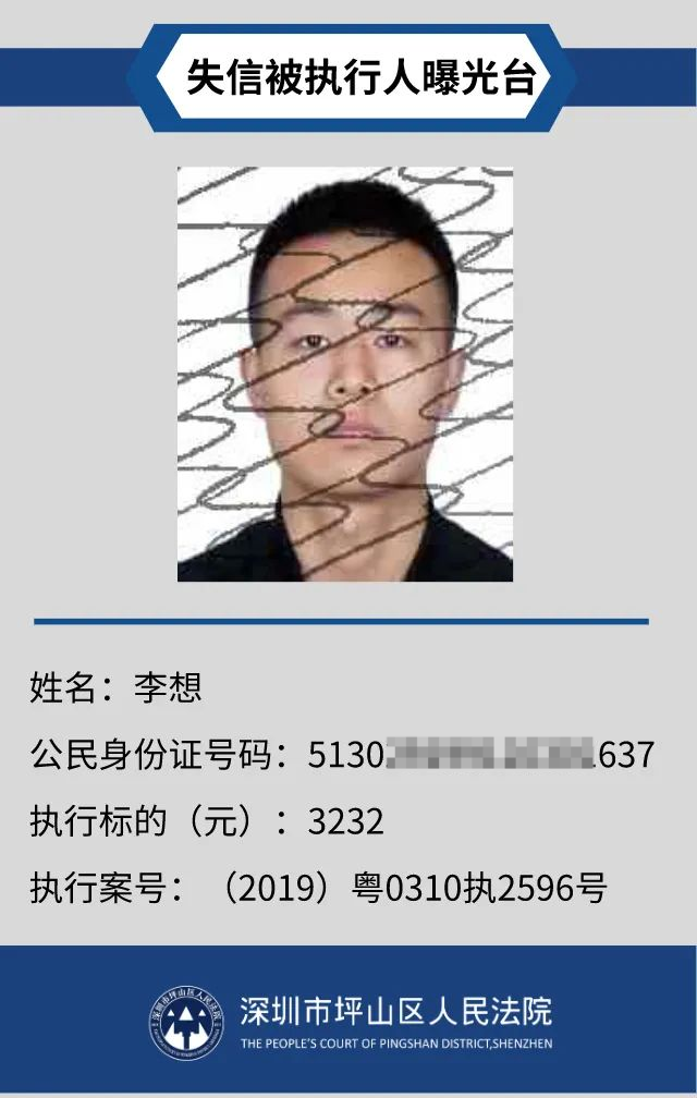 為督促被執(zhí)行人自覺履行生效法律文書確定的義務,推進社會誠信體系建設,深圳市坪山區(qū)人民法院根據(jù)《中華人民共和國民事訴訟法》第二百五十五條、《最高人民法院公布失信被執(zhí)行人名單信息若干規(guī)定》第一條和第七條之規(guī)定,現(xiàn)對31名失信被執(zhí)行人予以公布。名單信息根據(jù)案件結(jié)案情況及時更新,歡迎舉報失信被執(zhí)行人行蹤及財產(chǎn)線索,相關(guān)信息核實請聯(lián)系深圳市坪山區(qū)人民法院執(zhí)行局。
