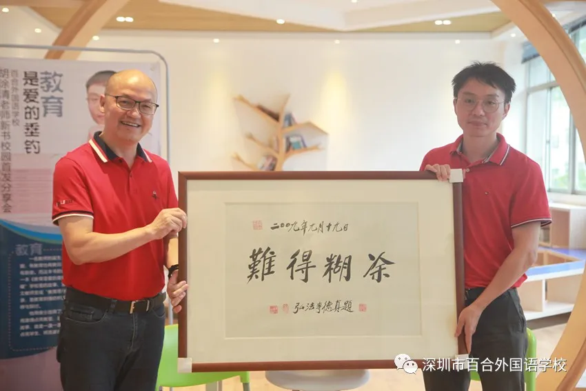 最后,朱正興校長給胡涂清老師贈送了一幅書法匾額作為“賀禮”,上面寫著“難得糊涂”。同時,朱校長也分享了自己的閱讀心得:“特別感謝胡老師,這是百外自成立以來第一位把自己的教育心路歷程以文字的形式集中展示給大家的老師,胡老師是我們的驕傲,也是我們學(xué)習(xí)的榜樣,是百外教育工作者的寫照縮影!胡老師對教育的堅守,對夢想的執(zhí)著追求,在重復(fù)輪回的工作中,做著統(tǒng)一卻又與眾不同的事,做成了教育詩歌,做成了教育散文。胡老師安靜卻不安分,清醒中保持一份糊涂,幾分激情,更有滿懷的豁達(dá)……”