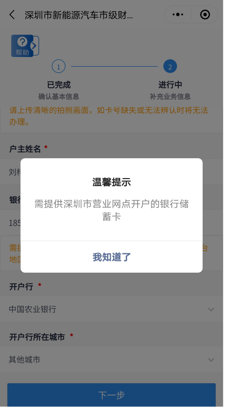 客戶需上傳銀行卡照片,并填寫銀行賬號(hào)、開戶行信息。開戶行如不在選項(xiàng)范圍內(nèi)可選擇“其他”自填。其中,銀行賬號(hào)需為深圳市營(yíng)業(yè)網(wǎng)點(diǎn)開戶的銀行一類儲(chǔ)蓄卡,華僑、港澳臺(tái)地區(qū)居民及外國人需提供深圳市建設(shè)銀行一類儲(chǔ)蓄卡。