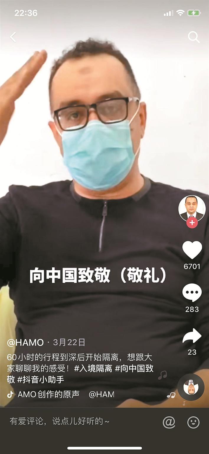 在方哈默所有抖音視頻中,點(diǎn)贊量最高的是對(duì)中國防疫工作兩次真情的致敬,他希望能借此呼吁所有入境人員都能百分之百遵從政府安排?!拔蚁M苡懈嗳丝梢钥吹街袊姆酪叽胧!狈焦谝曨l中說道,“中國所有的防疫工作者都很贊,他們24小時(shí)不間斷工作,你根本想象不到有多辛苦,我希望每個(gè)入境人員都百分之百遵守政府的安排?!彼麧M懷信心地表示,接下來也會(huì)把在羅湖的抗疫短視頻拍下去,希望借此機(jī)會(huì)可以把中國的聲音傳到更遠(yuǎn)的地方,向世界傳遞中國力量。