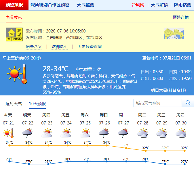 見圳客戶端·深圳新聞網(wǎng)2020年7月21日訊 今日多云間晴天,局地短時(shí)雷陣雨;氣溫28-34℃,中北部可達(dá)35℃以上;偏南風(fēng)3級(jí),沿海、高地和海區(qū)最大陣風(fēng)6級(jí);濕度55%-95%。22日晴天間多云,局地短時(shí)陣雨。23-27日,天氣悶熱,局地短時(shí)陣雨。深圳市氣象臺(tái)20日16時(shí)發(fā)布